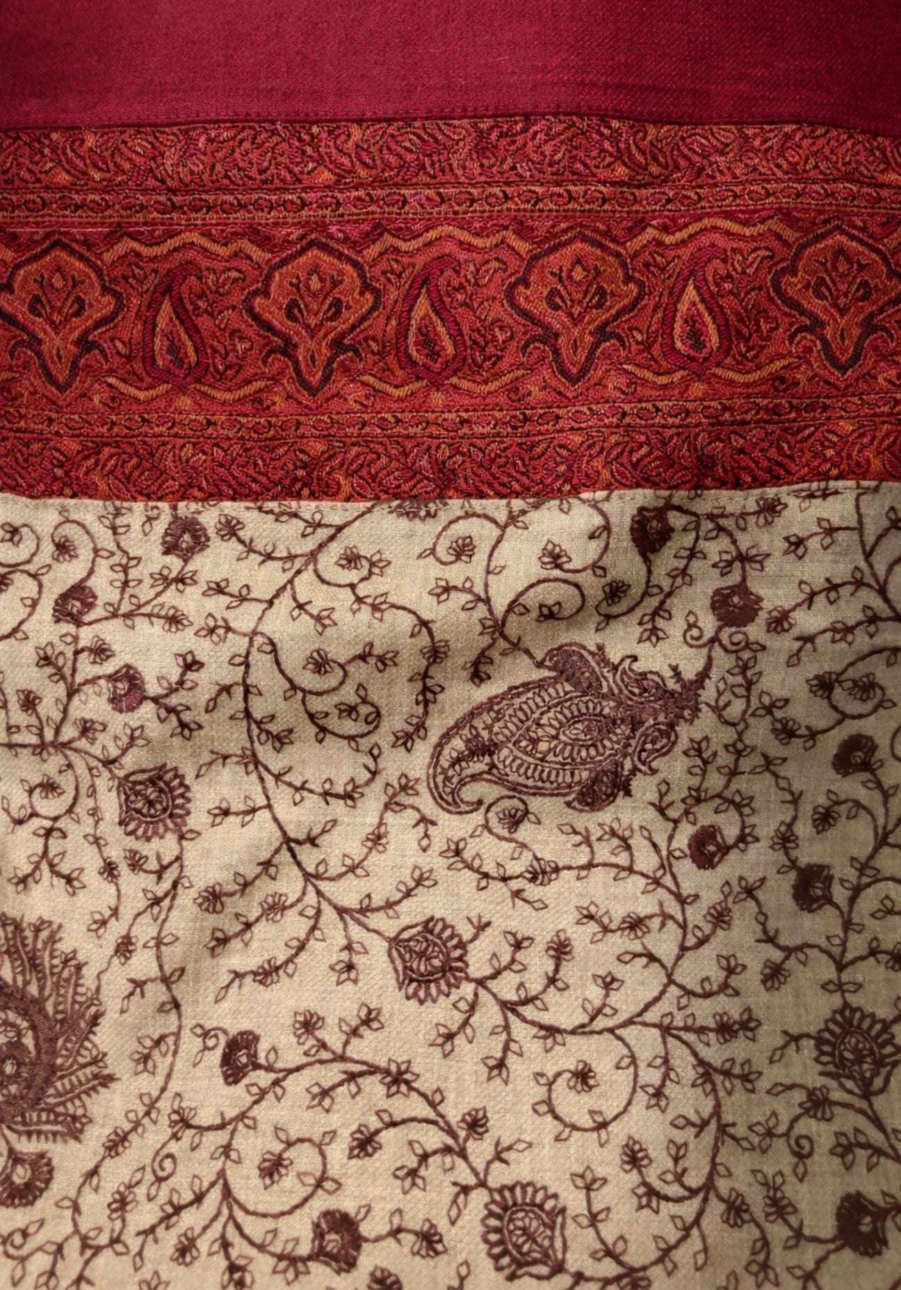 A timeless wool blend shawl crafted in rich shades of deep red, warm beige, and earthy brown. Featuring classic paisley motifs, this piece brings warmth, texture, and understated elegance to everyday and elevated looks.